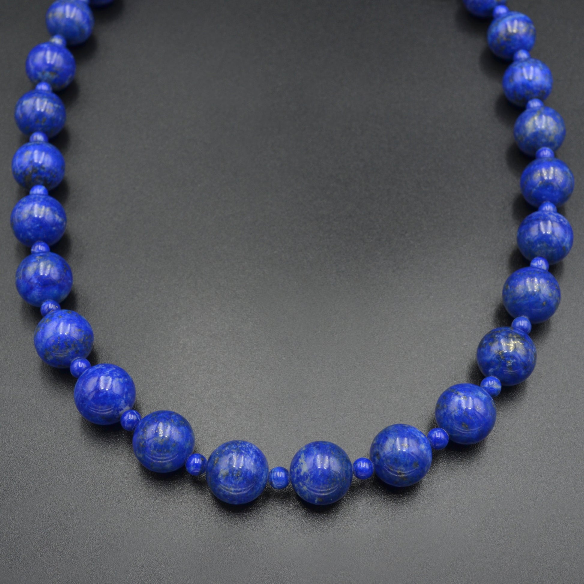 A vivid beaded standard length necklace of deep blue lapis lazuli beads of two sizes, strung in an alternating pattern. Lapis lazuli is a hardstone gem treasured for the deep and vivid hues of blue in which it occurs. This necklace features lapis richly dappled with metallic pyrite and calcite inclusions, beautiful natural embellishments often found in this gemstone. Fastens with a 14 karat yellow gold lobster style clasp that brightly contrasts the beautiful hue of the beads.