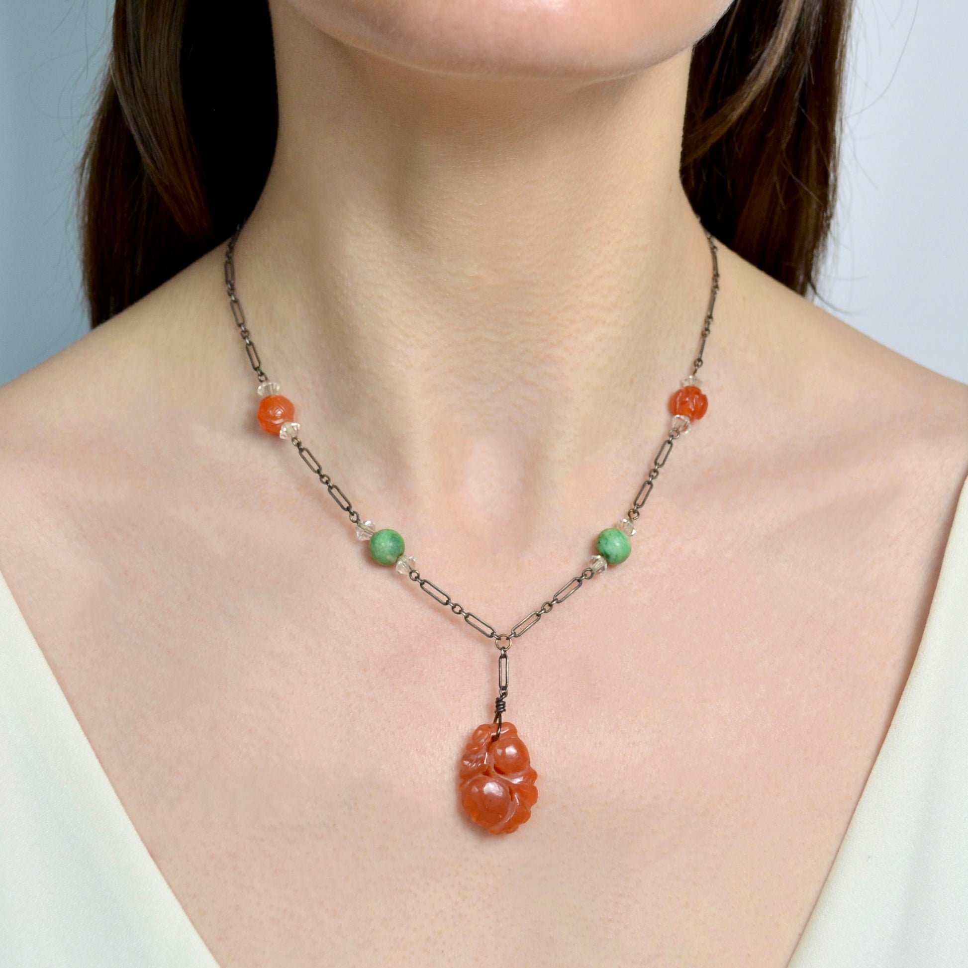 A captivating jewel dating from the Art Deco era and of Chinese origin, this lavaliere necklace features a carnelian, ornately carved to depict peaches, a symbol of longevity and vitality. The chain is a Figaro style chain of oxidized silver, along which are four stations of alternating crystal, carved carnelian and dyed green stones. Fastens with a spring ring style clasp.