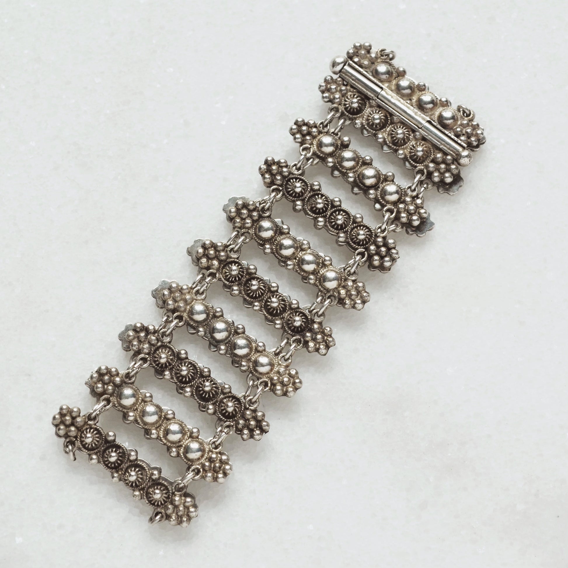 A beautifully crafted Etruscan revival style bracelet consisting of 20 linked panels, each with alternating textural cannetille designs. Crafted from 800 silver, the bracelet is eye-catching and has a lovely weight and a low profile. The back of each panel is polished and the bracelet fastens with a locking pin mechanism. The bracelet has been polished but the lovely patina (which silver jewelry naturally acquires over its lifetime) remains.