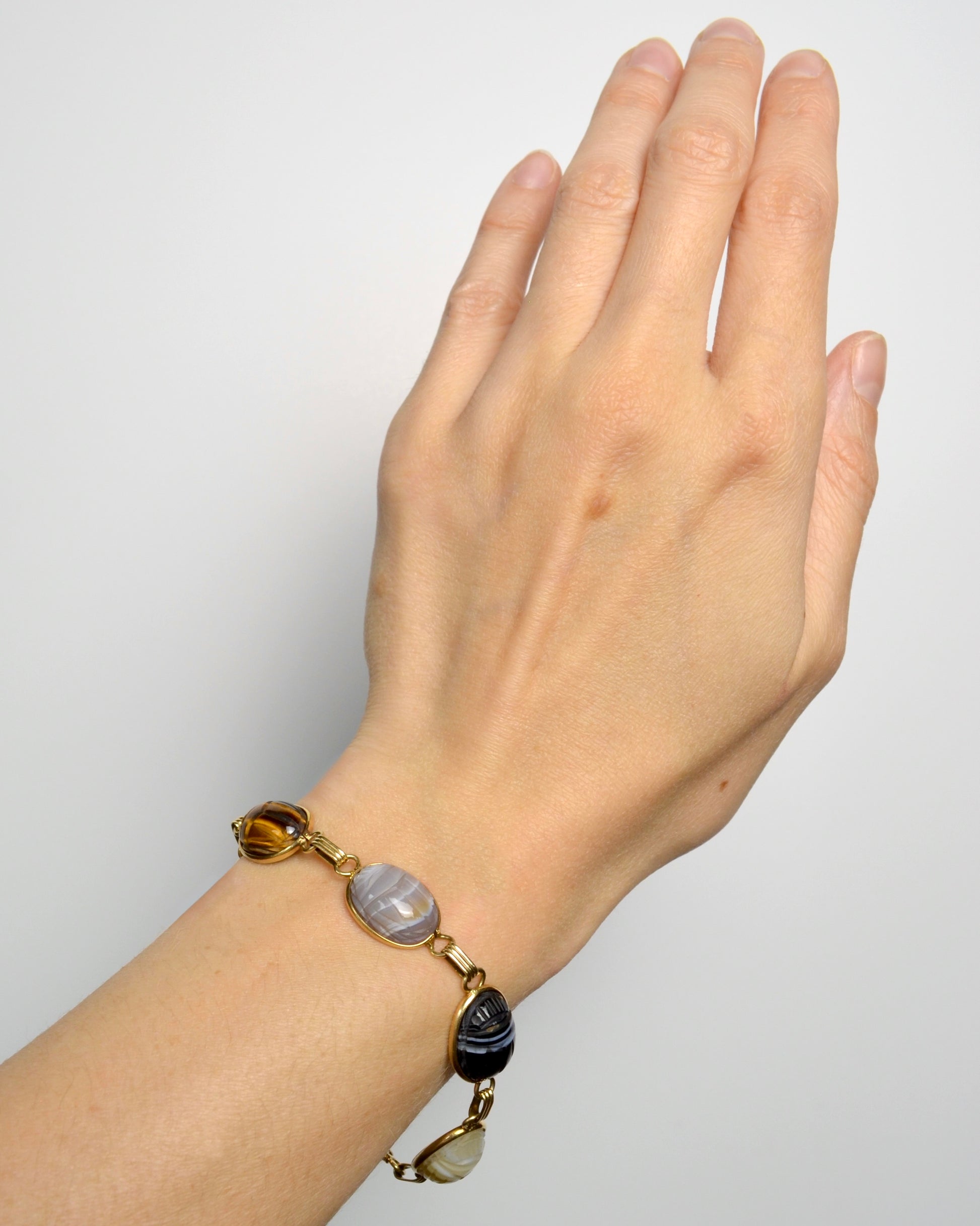 This bracelet was made in the middle of the 20th century and consists of seven carved scarabs - each encircled by a golden bezel - set in a row with a golden link between each. The gems of this bracelet are cabochon shaped with beautiful and thoughtfully carved details on both the front and reverse sides; they include: amethyst, tigers eye and four colors of banded agate scarabs. The bracelet is fashioned from 14 karat yellow gold and fastens with a spring ring style clasp.