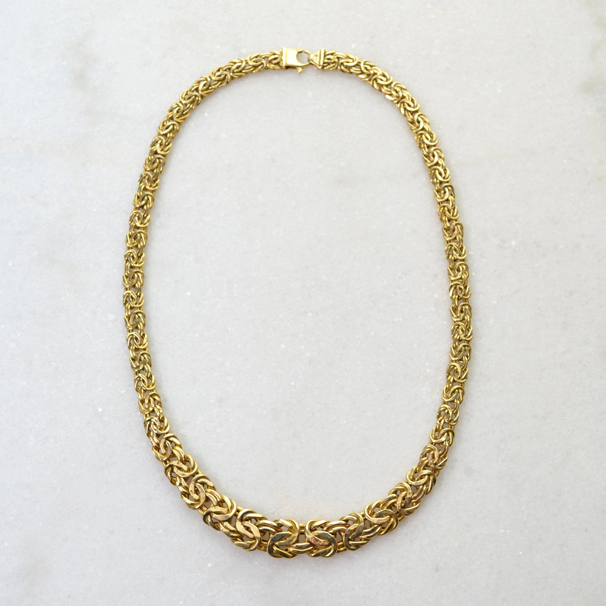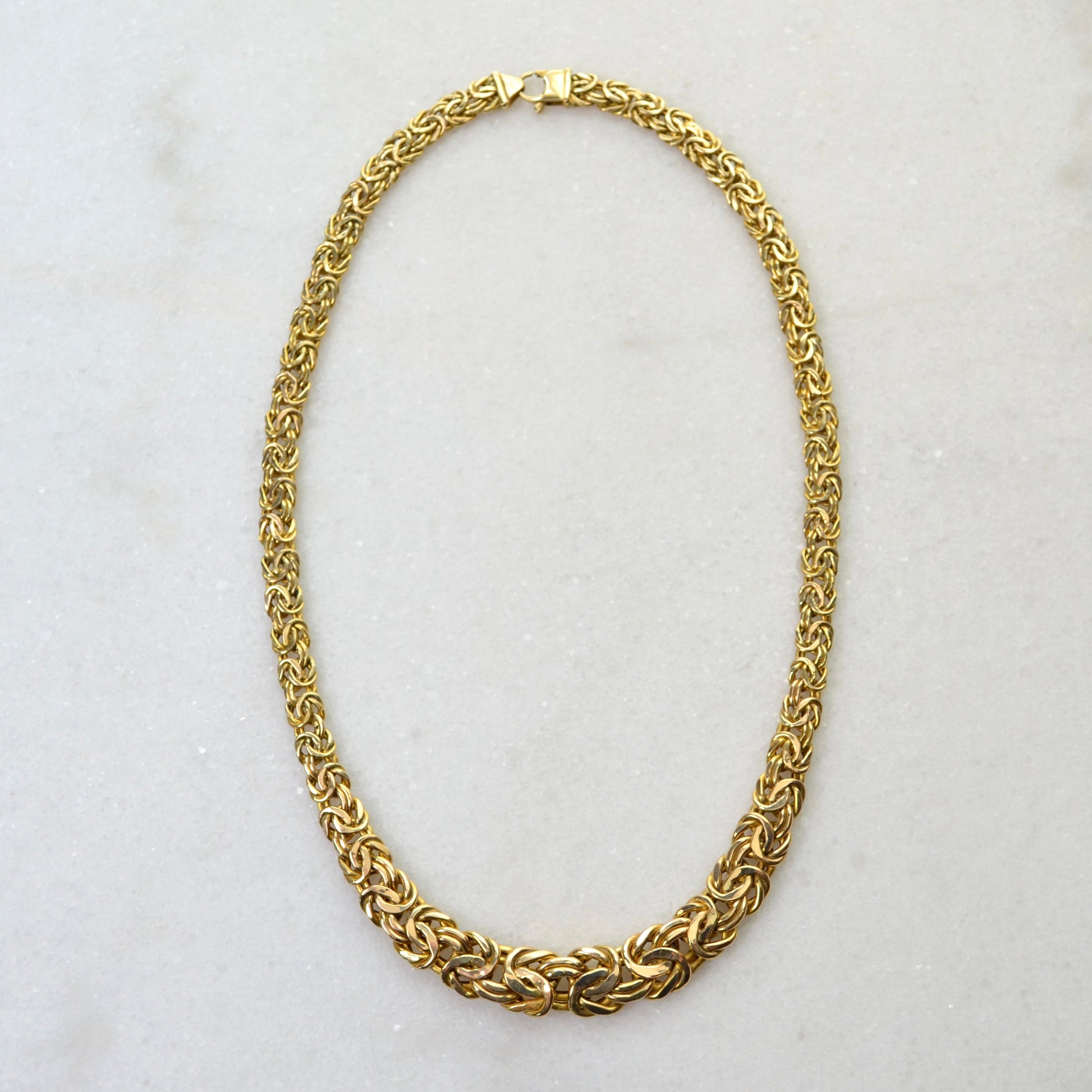 A Byzantine chain is an intricate style of chain wherein each link of a necklace intersects four others. Sometimes called an “Etruscan chain” these chains are known for their masterful workmanship, heft and durability. They are both flexible and strong (and beautiful!) The design of this particular chain takes the motif to a new level: a graduated chain with the largest links in the center, tapering on either side towards the clasp. This chain is fashioned in 14k yellow gold and features a beautiful polished finish. It would look amazing layered with other necklaces - its 17” length is perfect to wear with slightly longer pendant necklaces. Fastens with a modified lobster clasp.