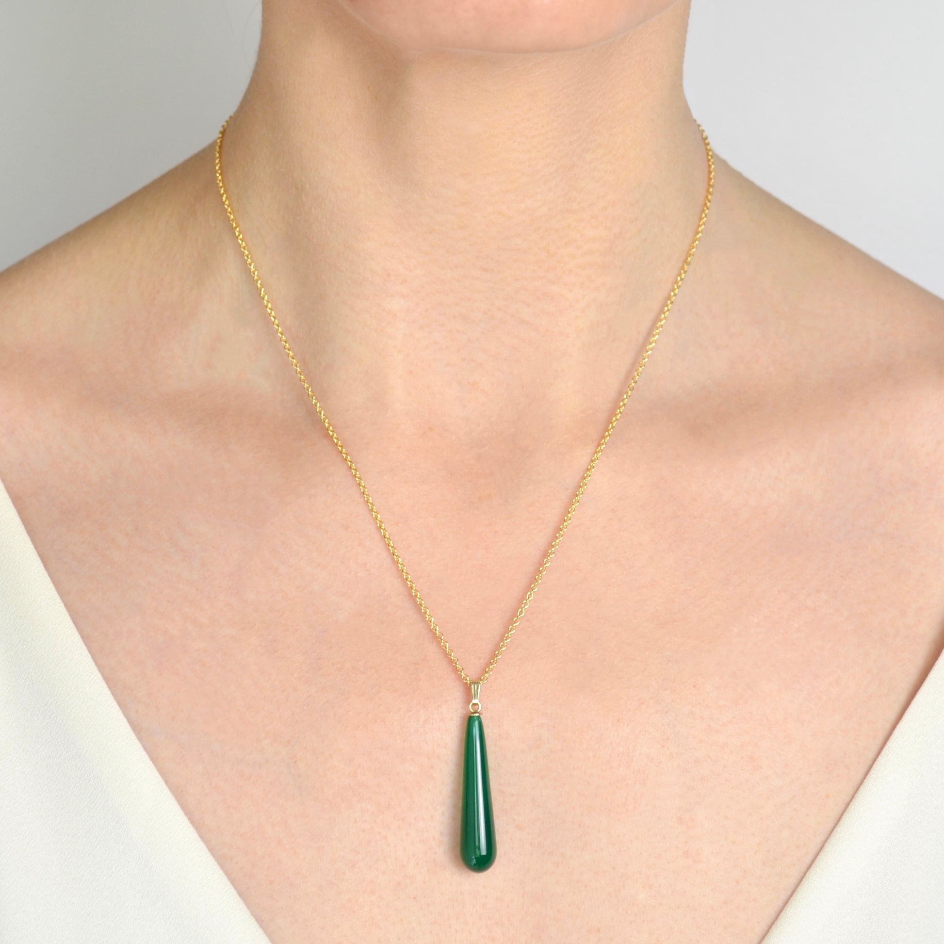 An eye-catching green and gold drop-style pendant necklace. Comprised of a polished, elongated emerald green colored glass “drop” set in a 14 karat yellow gold cap and bail. The pendant hangs on a gold-filled cable chain, which fastens with a lobster style clasp.